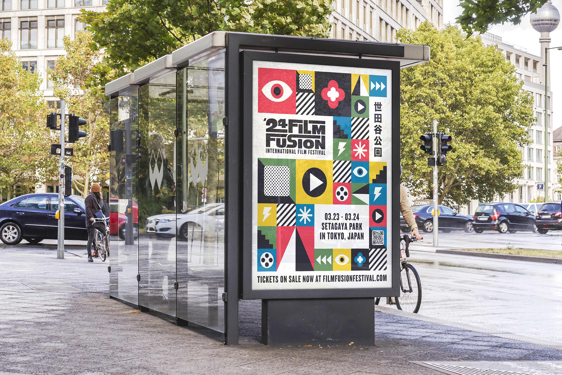 Film Fusion is an international film festival in Tokyo, celebrating global cinema with bold, modern branding. Inspired by contemporary Japanese design, it features vibrant colors, clean typography, and playful minimalism. Key elements include merchandise, an immersive 3D entry gate, and an animated poster that captures the festival’s lively spirit.