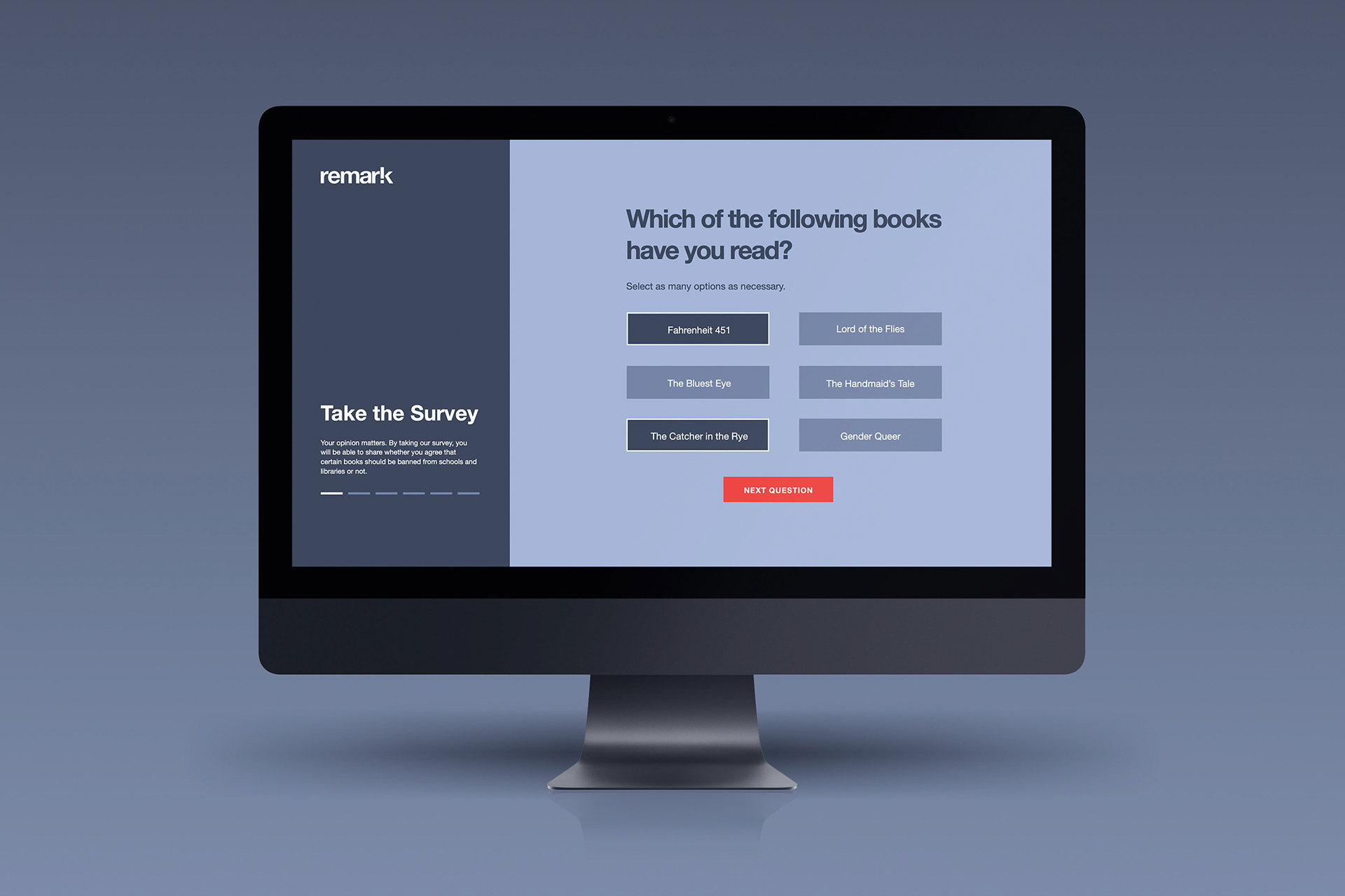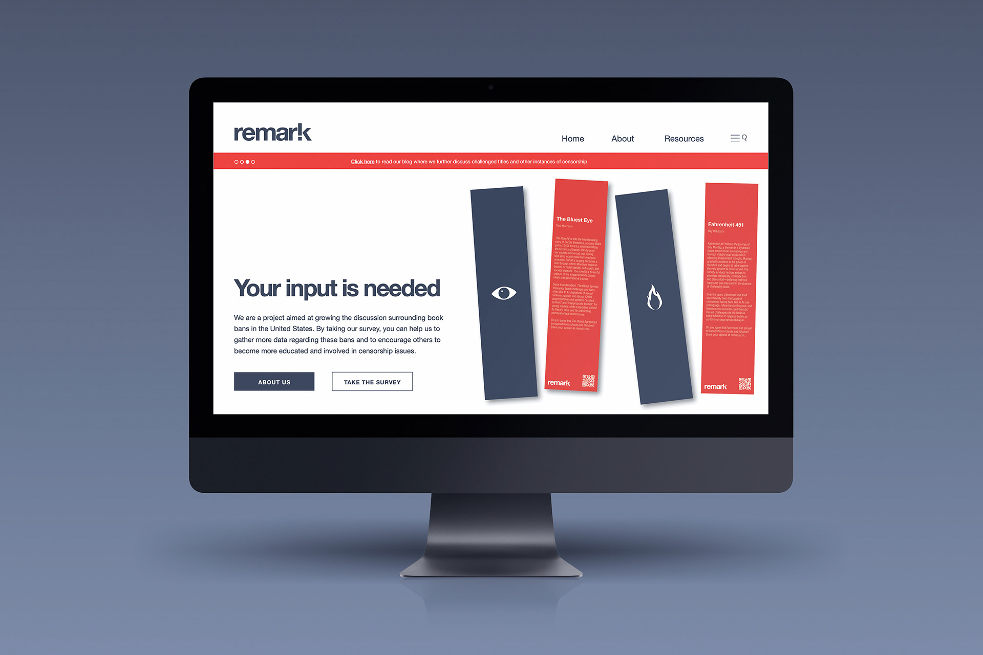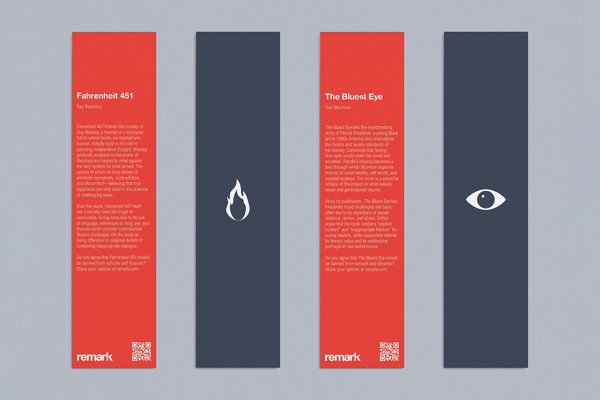 Remark raises awareness about U.S. book bans through interactive bookmarks. Each features a banned book’s synopsis and censorship reasons, plus a QR code which directs viewers to a survey on the Remark website. By collecting opinions and sparking dialogue, Remark encourages readers to engage in issues of censorship and intellectual freedom.