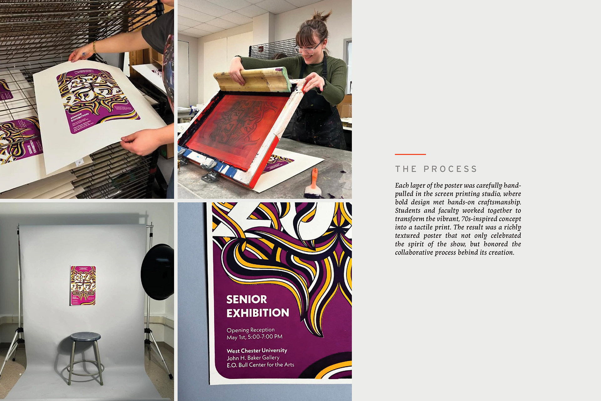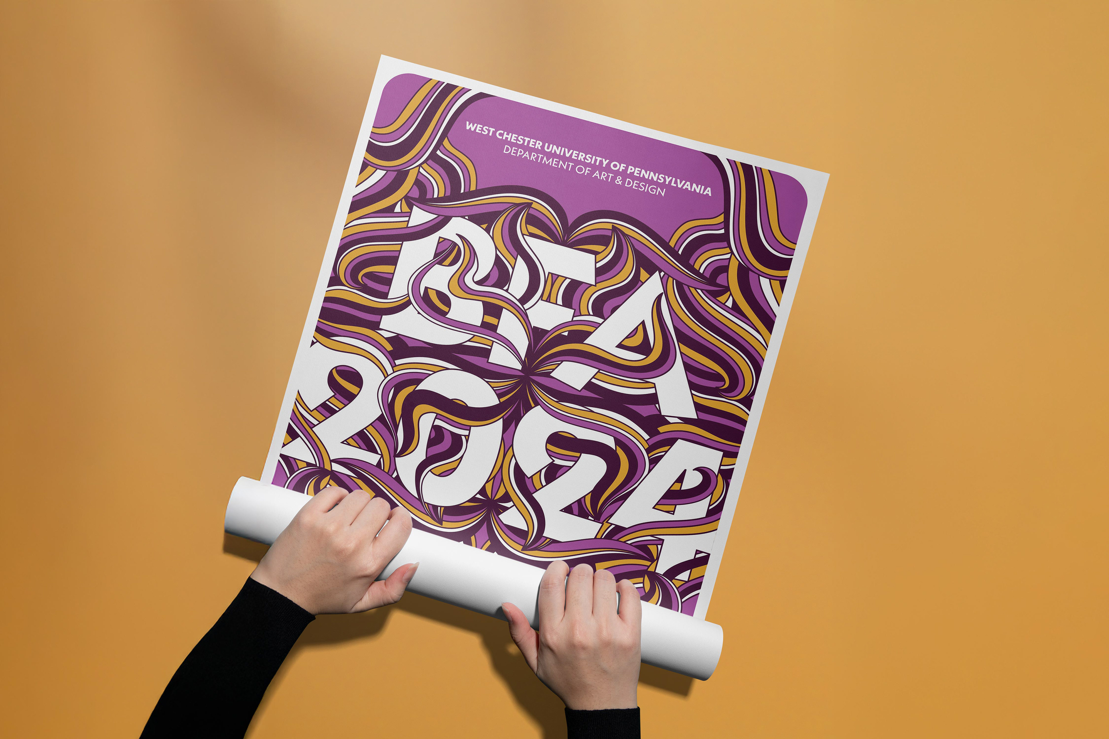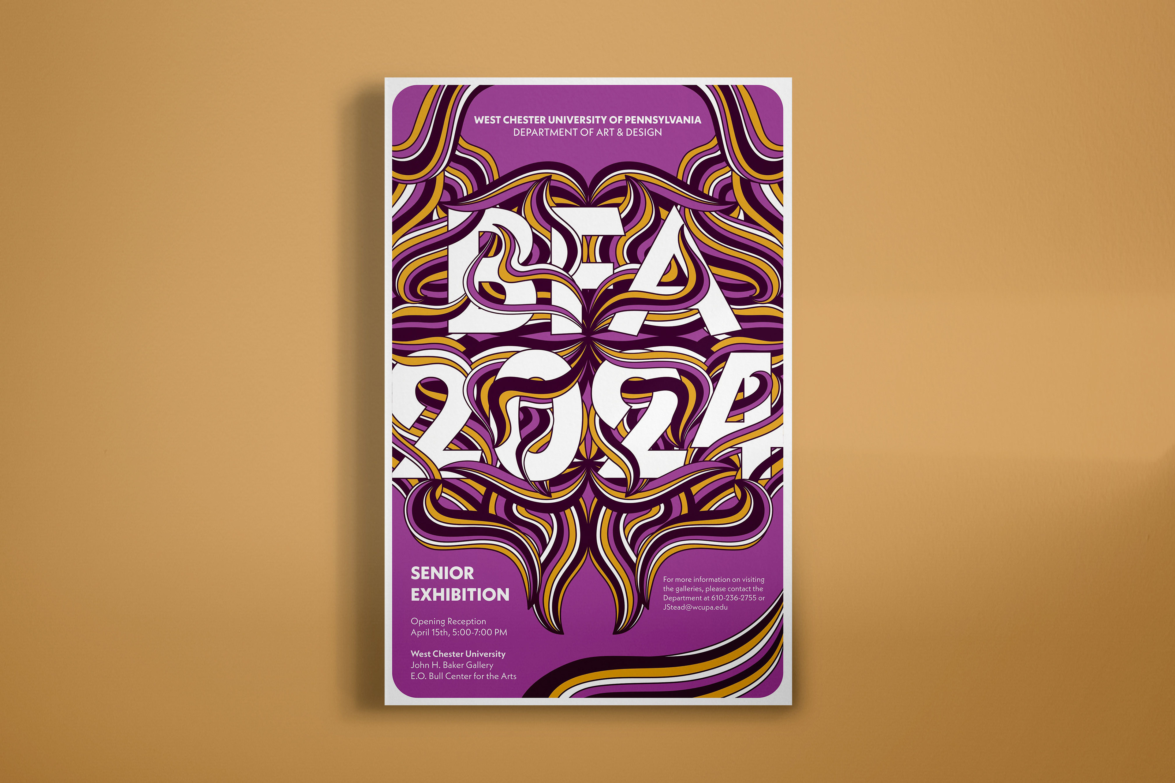 This poster for the 2024 West Chester University Senior BFA Show is a bold, 70s-inspired design that channels the iconic style of Milton Glaser. Featuring flowing shapes in rich purples, golds, and whites, the psychedelic composition creates an energetic and immersive visual experience. The design was selected by the university’s design faculty and brought to life through a collaboration with the West Chester University Screen Printing Department, ensuring a unique, handcrafted final piece that embodies both artistic expression and technical craftsmanship.